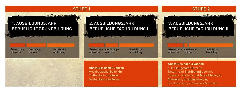 Deine Bauausbildung umfasst im ersten Lehrjahr die berufliche Grundausbildung. Im zweiten Lehrjahr folgt die berufsbezogene Ausbildung zum Hochbau-, Tiefbau- und Ausbaufacharbeiter/in, die ggf. mit der Abschlussprüfung des zweijährigen Berufes endet.
